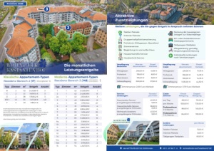 Attraktive Zusatzleistungen Preisliste 2026 Die monatlichen Leistungsentgelte Klassische Appartement-Typen Moderne Appartement-Typen Residenz Bereich 2 (17) Residenz Bereich 3 (148) 1 Zimmer Appartements - 78 2 Zimmer Appartements - 68 3 Zimmer Appartements - 2 1,5 Zimmer Appartements - 6 2 Zimmer Appartements - 11 Typ Zimmer m2 Entgelt Anzahl B 2 52 2.425,83 € 2 C 2 41 1.909,74 € 3 D 2 38 1.768,42 € 3 E/E-1 1,5 30 1.417,48 € 4/2 F 2 40 1.862,11 € 3 Typ Zimmer m2 Entgelt Anzahl 1 1 42 2.448,08 € 1 2 1 42 2.448,08 € 8 2a 1 43 2.530,65 € 3 3 2 49 2.894,28 € 8 4 1 33 1.779,73 € 27 5 2 51 2.970,51 € 4 6 2 49 2.894,28 € 4 7 1 30 1.619,46 € 25 8 2 46 2.706,90 € 16 9 2 59 3.486,60 € 16 9a 2 57 3.369,10 € 4 10 1 40 2.343,27 € 10 11 1 48 2.830,79 € 4 12 2 53 3.118,18 € 5 13 2 61 3.562,83 € 4 14 2 70 4.056,23 € 2 14a 2 66 3.915,35 € 2 14b 2 70 3.915,35 € 2 15 3 74 4.347,30 € 2 Die Preise benennen das monatliche Entgelt aller im Leistungsverzeichnis aufgeführten Leistungen in den Bereichen Wohnen und Betreuung. Bei Einzug einer 2. Person beträgt der monatliche Zuschlag in allen Bereichen 346,10 €. Die Kaution umfasst das zweifache Leistungsentgelt. Alle Preise gültig ab: 01.01.2026 WOHNPARK KASTANIENHOF Weitere Leistungen, die Sie gegen Entgelt in Anspruch nehmen können Telefon-Flatrate Nutzung der hauseigenen Anlagen zur Wäschepflege Hauswirtschafts-Service Haustechnik-Service Begleitung im und außer Haus Zimmerservice Individuelle Leistungen nach Verinbarungen Frühstück, Mittagessen, Abendbrot Pflegeleistung gemäßg Vergütungsvereinbarung Gruppenhaftpflichtversicherung Tiefgaragen-Stellplatz Internet-Flatrate Ein- oder ZweibettzimmerGästeappartements Verpflegung Bewohner Monats- Abonnement Einzel- Mahlzeit Mittagessen 250,00 € 12,65 € Frühstück 139,00 € 8,00 € Abendessen 139,00 € 8,00 € Vollverpflegung 500,00 € 27,00 € Verpflegung Gäste Monats- Abonnement Einzel- Mahlzeit Mittagessen 425,00 € 17,25 € Frühstück 362,00 € 14,35 € Abendessen 362,00 € 14,35 € Vollverpflegung 1.035,00 € 44,50 € GästeZimmer EinzelBelegung DoppelBelegung pro Tag 85,00 € 115,00 € pro Woche 525,00 € 725,00 € Probewohnen 3-6 Nächte 89,00 € 145,00 € Probewohnen 7-14 Nächte 84,00 € 130,00 € ServiceLeistungen Stunde / pro 5 Min Hausmeister-Service je angefangene 5 Minuten 42,00 € 3,50 € Hauswirtschafts-Service je angefangene 5 Minuten 36,60 € 3,05 € Wohnpark-Assistenz je angefangene 5 Minuten 43,20 € 3,60 € Andere Leistungen pro Monat Telefon-Flatrate 13,00 € Internet-Flatrate 12,00 € Tiefgaragen Parkplatz 65,00 € Zimmerservice: 2,65 € pro Mahlzeit Zimmerservice: 3,75 € pro Mahlzeit 05 11 - 87 80 7 - 0 WOHNPARK-KASTANIENHOF.DE AM MITTELFELDE 102, 30519 HAN-