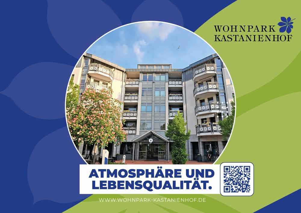 wir freuen uns über Ihr Interesse am Wohnpark Kastanienhof und senden Ihnen gern Informationsmaterial, aus dem Sie unser umfassendes Leistungs- und Wohnangebot entnehmen können. In unserer Wohnparkzeitung “Kastanie” finden Sie Lesenswertes über das Leben in der Residenz. Und sicher vermittelt auch der Film auf unserer Homepage www.wohnpark-kastanienhof.de viele Eindrücke zum Kastanienhof.